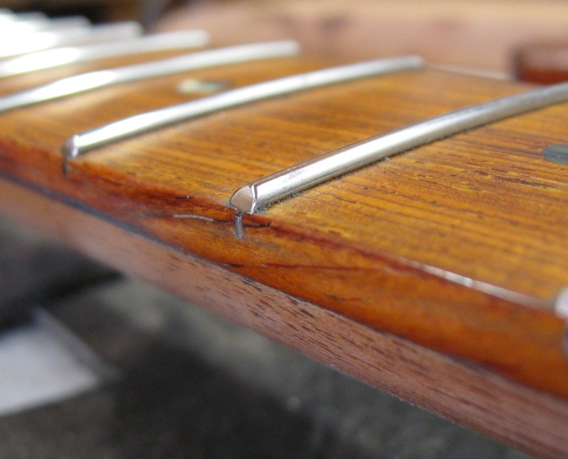 Fret ends are dressed with a small file then polished with micro-mesh. The micro-mesh also breaks the sharp edge of the fingerboard.
